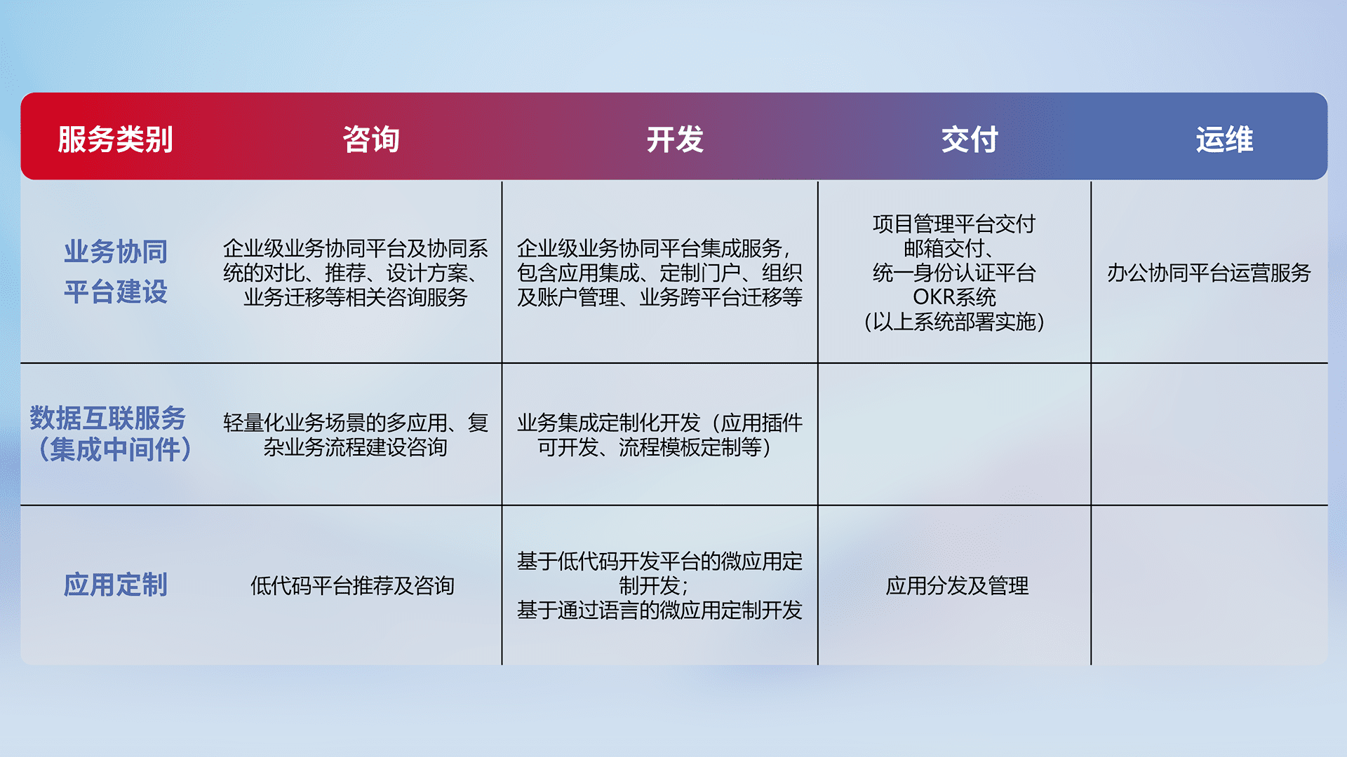针对钉钉、、、、企微、、IDaas等平台级产品提供产品的规划、、、方案、、、、交付、、定制化开发等服务,,,实现如统一协同办公、、、智能客户服务、、、、混合会议管理、、智能数据查询、、、等业务场景,,实现数字化转型。。。。