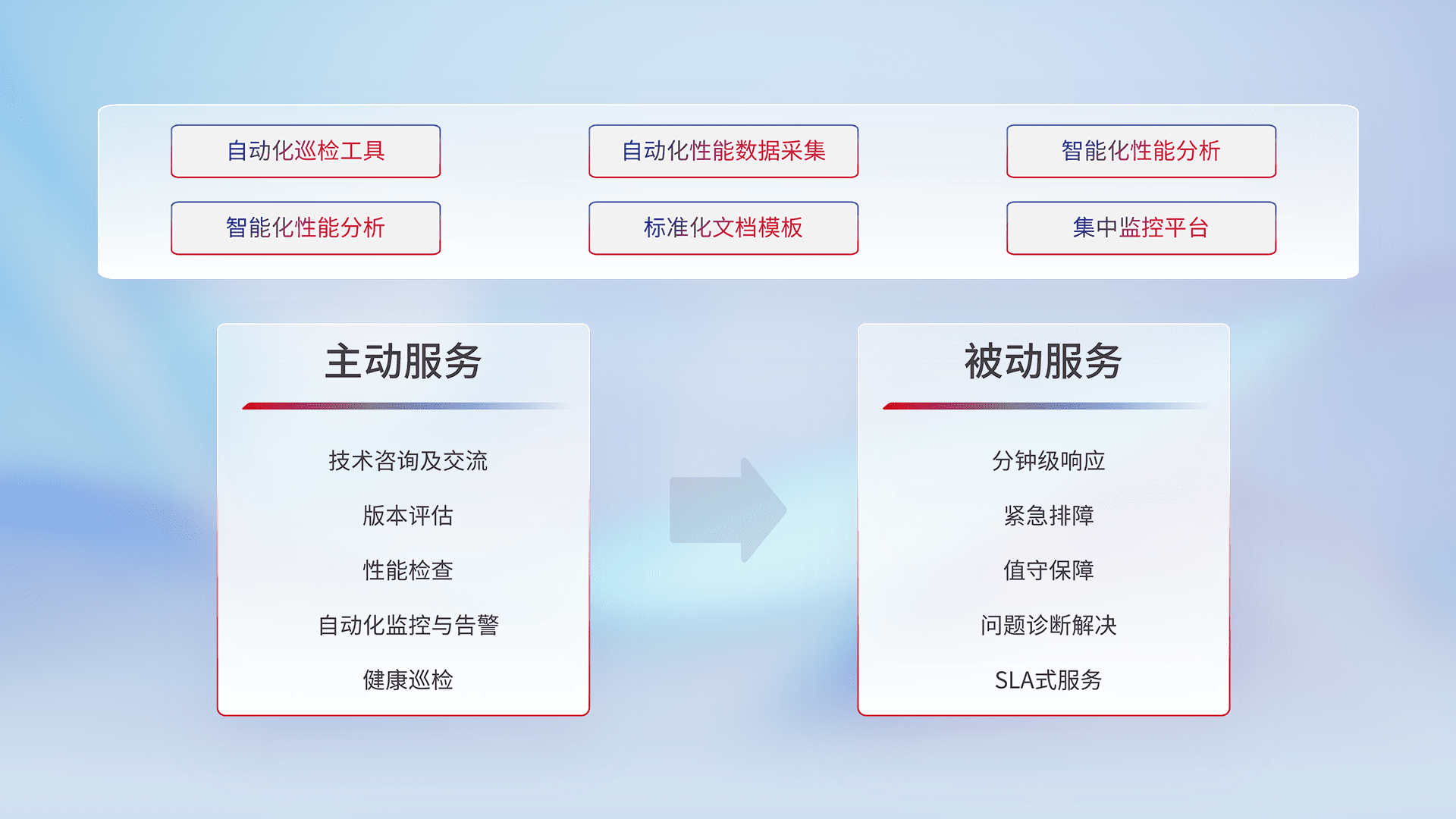 智能化工具和标准化文档,,保障服务质量,,,,提供主动服务(包含技术咨询、、版本评估、、、、性能检查、、、、自动化监控与告警、、健康巡检)和被动服务包含(分钟级响应、、、紧急排障、、、、值守保障、、问题诊断解决、、、、SLA服务)。。。。
